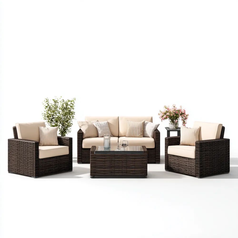 Garten Sitzgruppe Rattan 120cm x 75cm x 78cm mit Kissen – Dunkelbraun/Creme – Moderner Stil